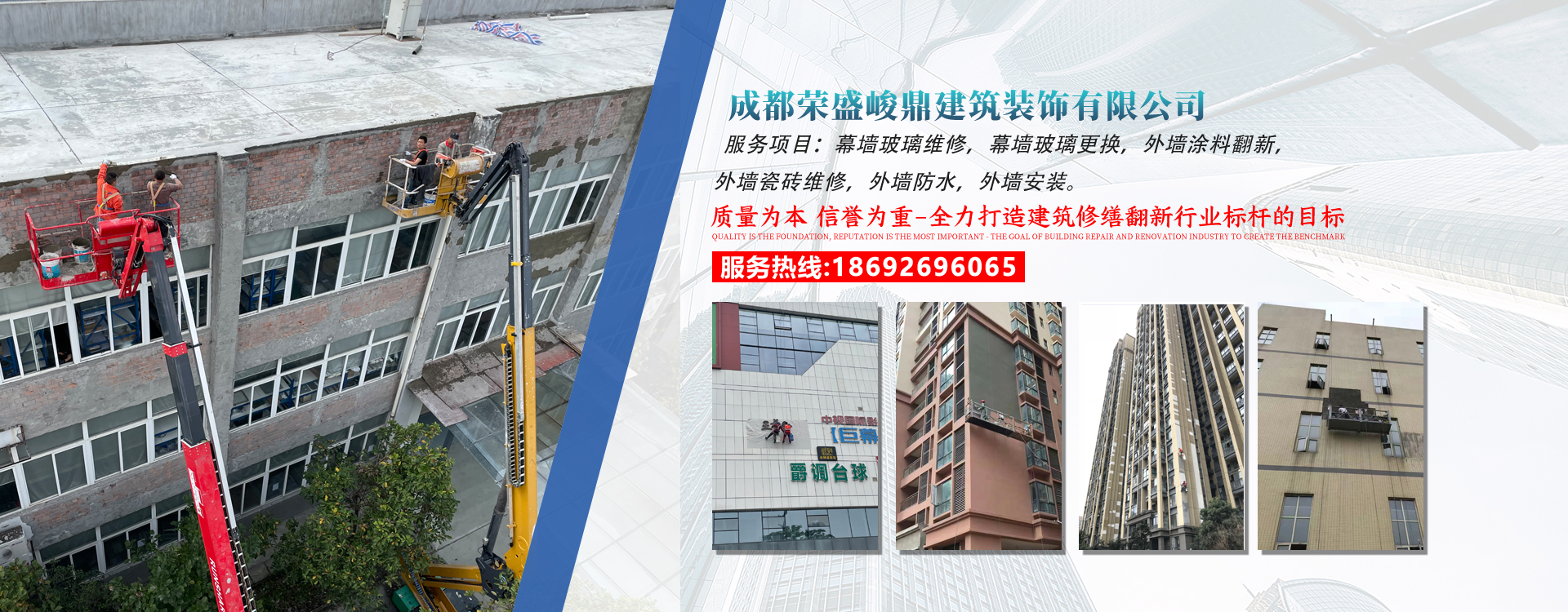 成都榮盛峻鼎建筑裝飾有限公司始終堅持發揚工匠精神的專業施工團隊,專業于舊建筑修繕翻新的研究與實踐;服務包括外墻維修、外墻翻新、外墻磚維修、外墻防水處理、內外墻涂料維修、幕墻玻璃維修、門...